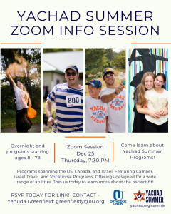 Join us for a virtual Info Session to learn all about Yachad Summer programs. Whether you are looking for camper programs, Israel travel, or vocational opportunities, we have something incredible for everyone (ages 8-78!) across the US, Canada, and Israel.
